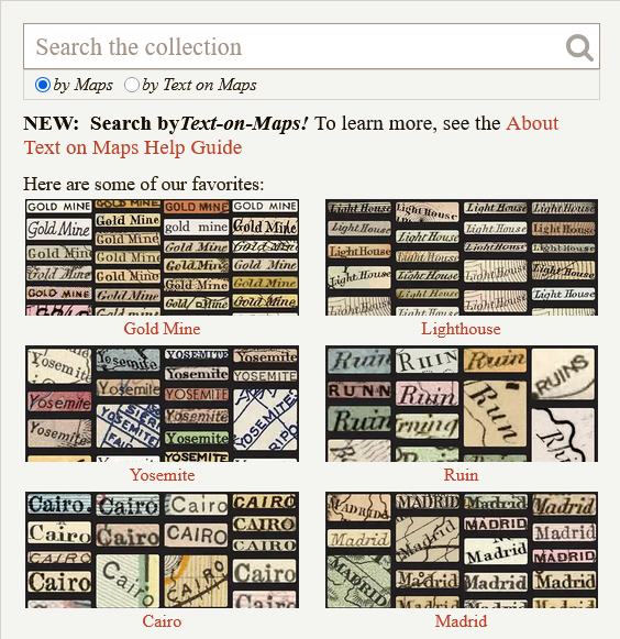 La collection de belles cartes anciennes de David Rumsey est la plus belle que je connaisse et aussi une des bases de données les plus ergonomiques et efficaces au monde. Tout est océrisé : on tape n’importe quel nom et le site nous retrouve toutes les cartes où ce nom apparaît. Magique et bluffant.